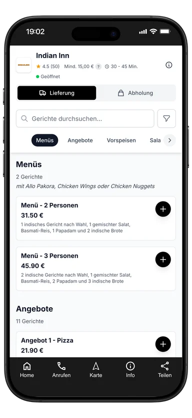 1 Familienpizza 45cm Margherita, 1 indisches Gericht und 1 Nudelgericht nach Wahl, 1 gemischter Salat und 1 alkoholfreies Getränk 1,0l nach Wahl